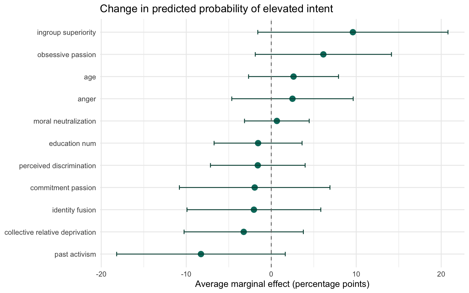 Protective tendency: past activism delivers the largest downward shift (-8.3 pp) and an odds ratio below one, signaling a potential buffer against violent intent.