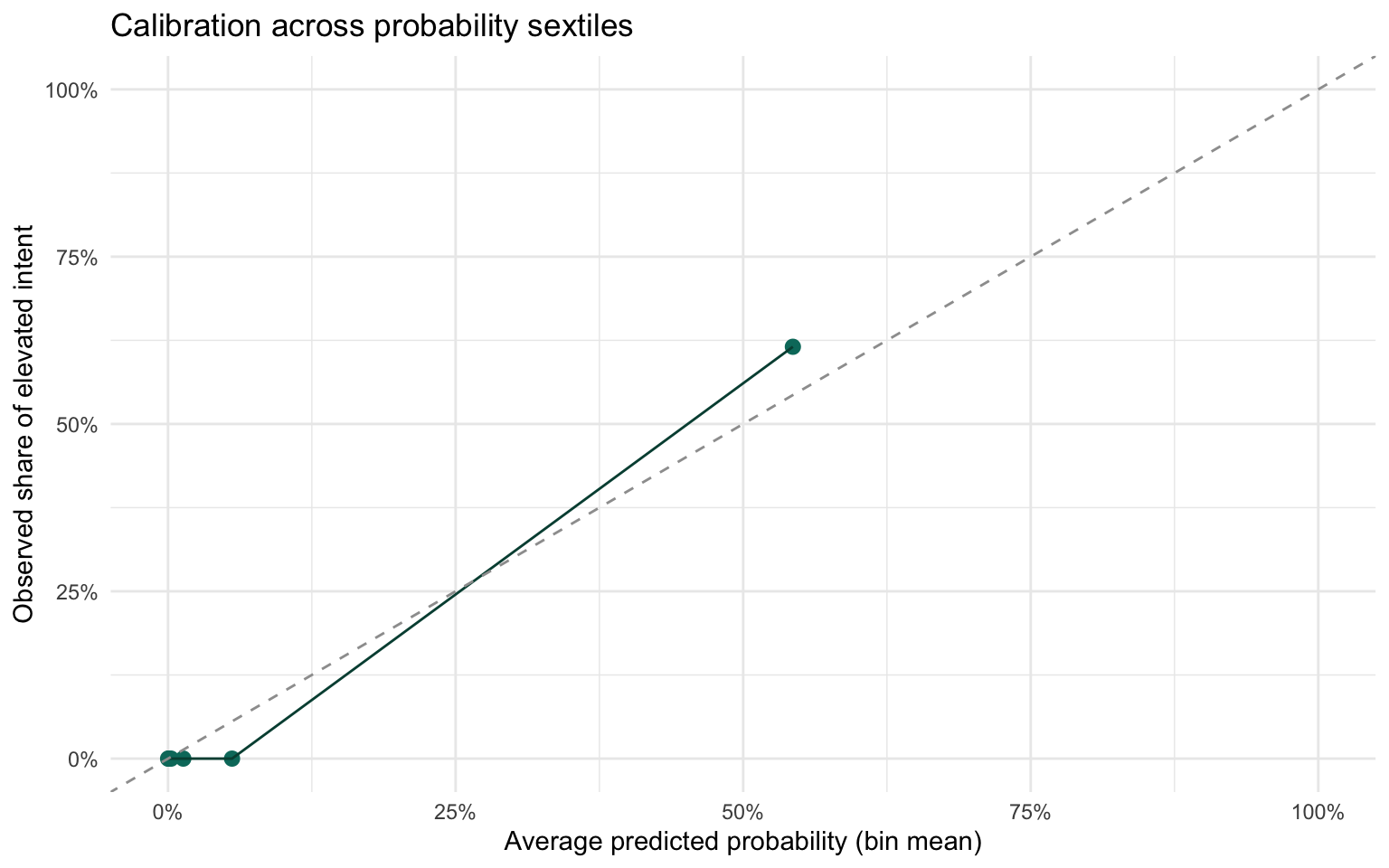 calibration_df %>%ggplot(aes(x = mean_pred, y = emp_rate)) +geom_point(size =2.5, colour ='#00796b') +geom_line(colour ='#004d40') +geom_abline(slope =1, intercept =0, linetype ='dashed', colour ='#9e9e9e') +scale_x_continuous(labels =percent_format(accuracy =1), limits =c(0, 1)) +scale_y_continuous(labels =percent_format(accuracy =1), limits =c(0, 1)) +labs(x ='Average predicted probability (bin mean)',y ='Observed share of elevated intent',title ='Calibration across probability sextiles' ) +theme_minimal()