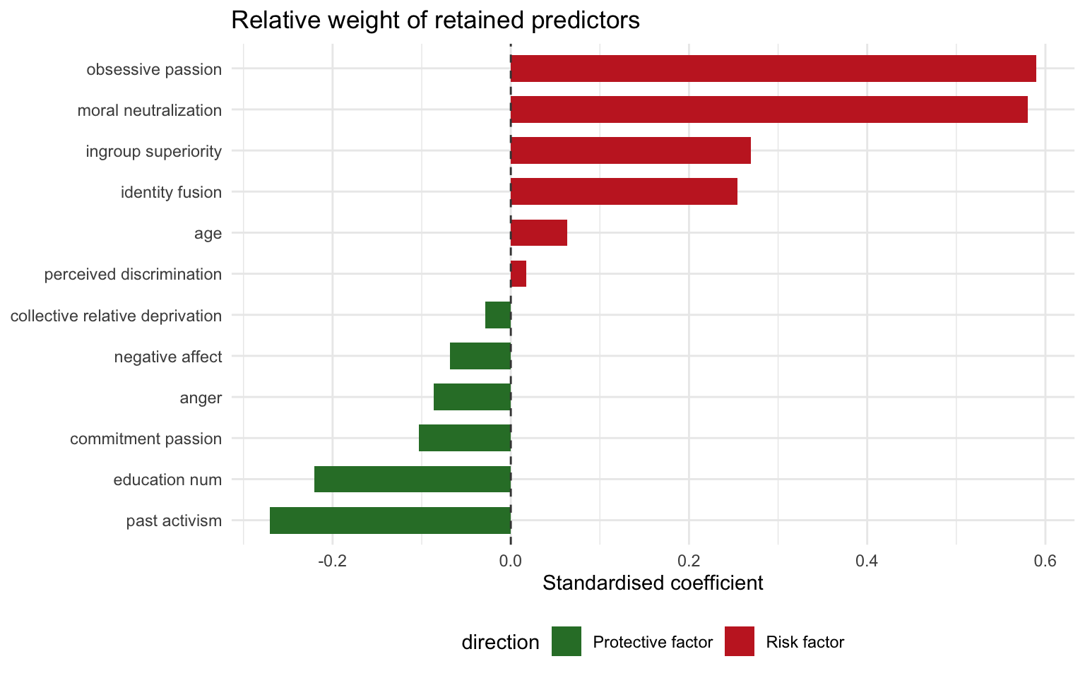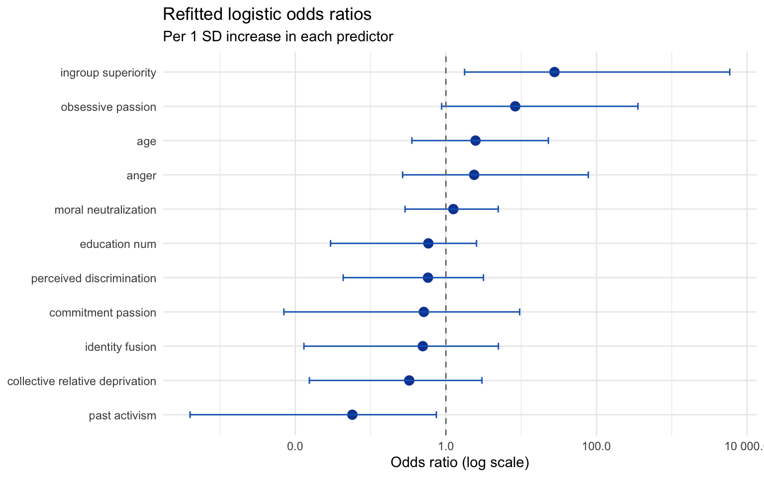 ingroup superiority remains the sharpest risk signal with an odds ratio of 27.71, whereas past activism leans protective (OR = 0.06).