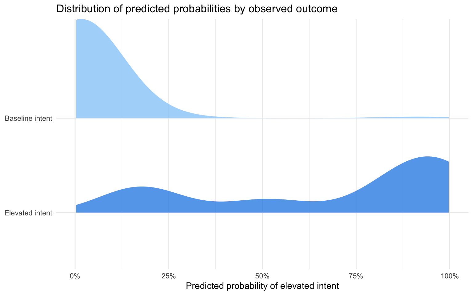 prediction_df %>%mutate(truth =fct_relevel(truth, 'Elevated intent')) %>%ggplot(aes(x = .pred, y = truth, fill = truth)) +geom_density_ridges(alpha =0.75, colour =NA, scale =1.05) +scale_x_continuous(labels =percent_format(accuracy =1), limits =c(0, 1)) +scale_fill_manual(values =c('Baseline intent'='#90caf9', 'Elevated intent'='#1e88e5')) +guides(fill ='none') +labs(x ='Predicted probability of elevated intent',y =NULL,title ='Distribution of predicted probabilities by observed outcome' ) +theme_minimal()