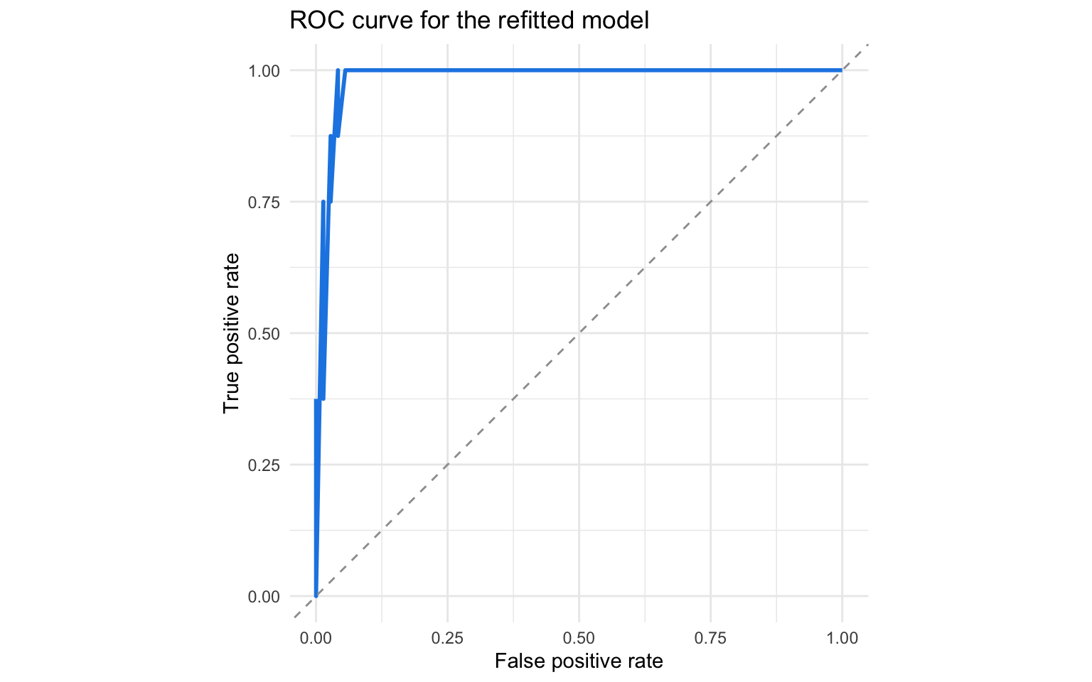 The refitted logistic attains an apparent AUC of 0.99 with a Brier score of 0.033. These values reflect in-sample performance; cross-validated optimism is already controlled upstream by the LASSO selection.