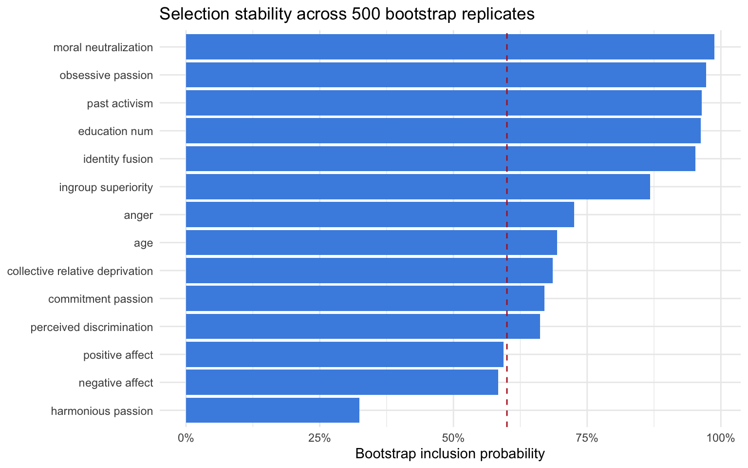 Variables with inclusion probability above the dashed line remain active in most bootstrap fits. Robust signals include moral neutralization (99%), obsessive passion (97%), past activism (96%), education num (96%), identity fusion (95%), ingroup superiority (87%), anger (73%), age (69%), collective relative deprivation (69%), commitment passion (67%), perceived discrimination (66%).