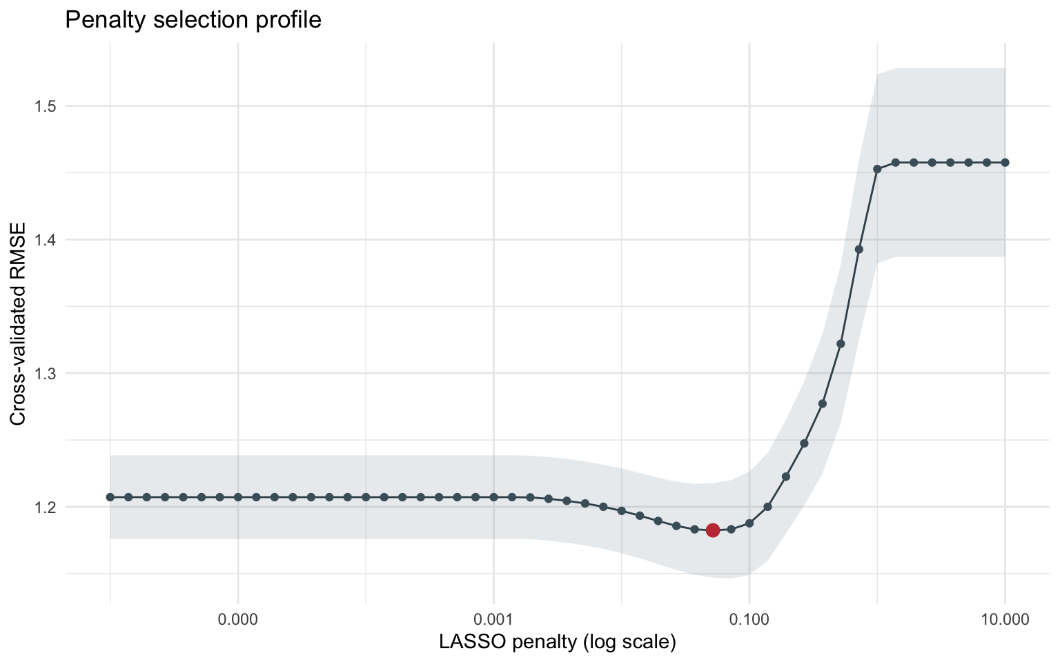 We adopt a tidy modeling workflow with five-fold cross-validation repeated 20 times (100 resamples total) to stabilise the penalty search. Predictors are median-imputed and standardized within each resample so that the LASSO penalty treats them on a comparable scale.