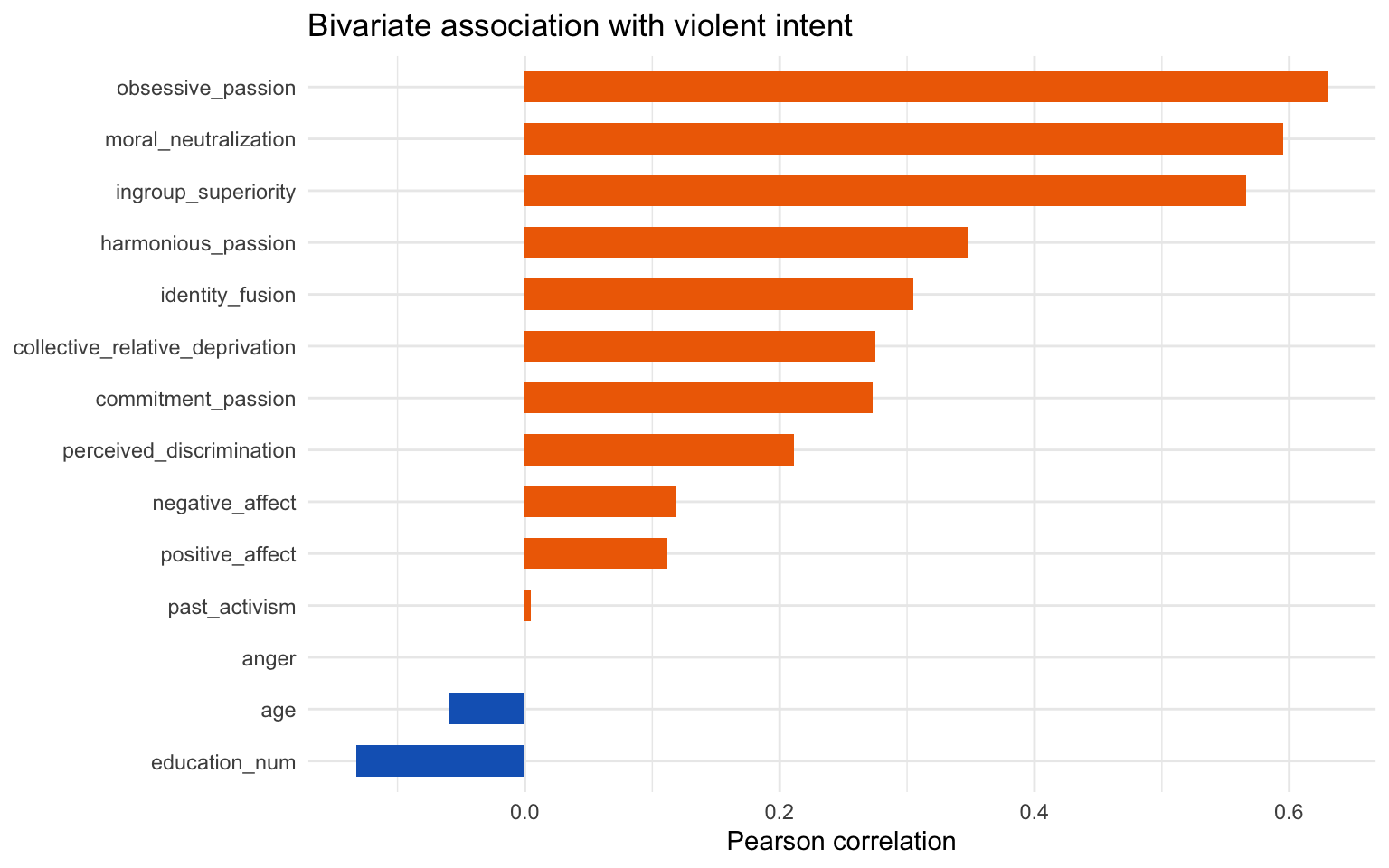 Activist passion measures, perceived discrimination, and ingroup superiority already show positive simple correlations with violent intent, but multicollinearity and noise require a penalised model to adjudicate which survive joint estimation.