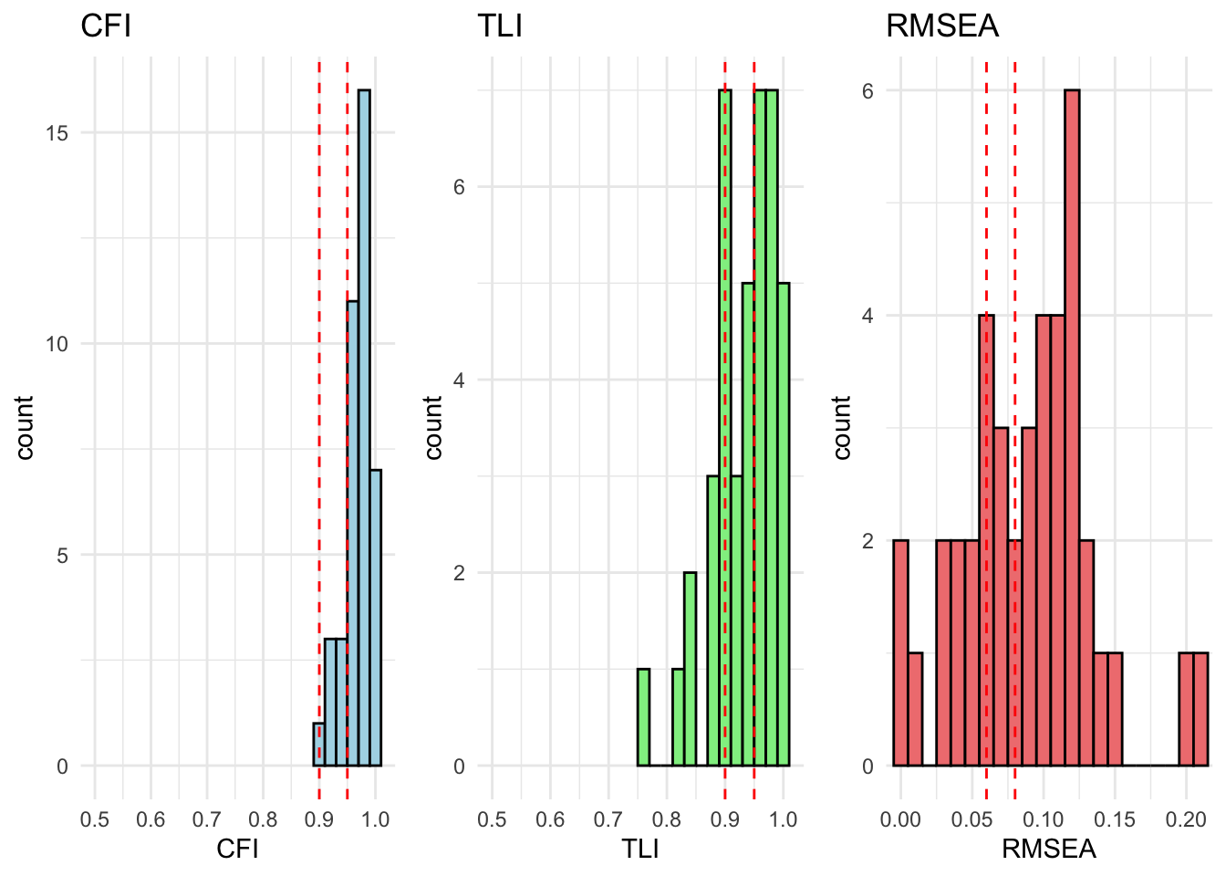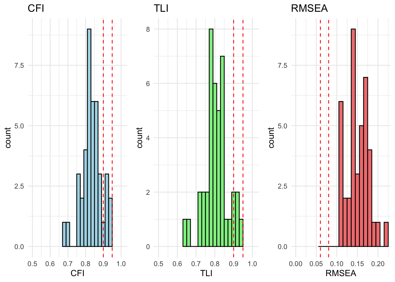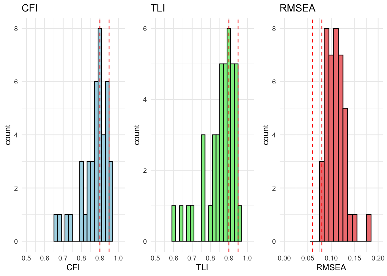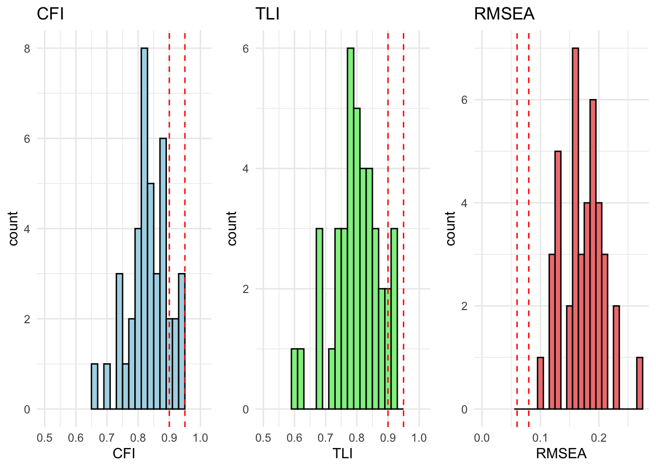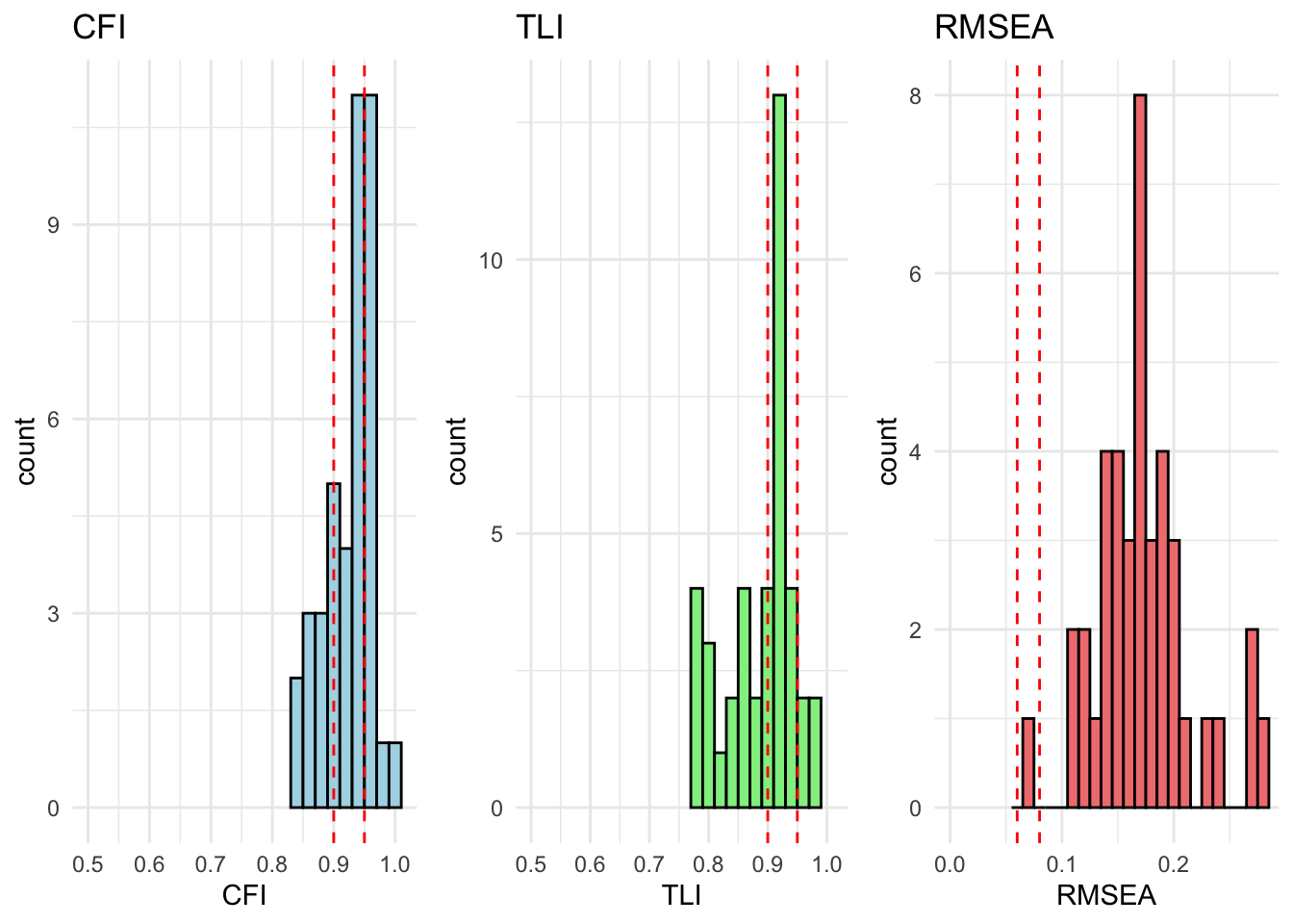 # extract relevant stats# result_fit_metric_df <- extract_fit_statistics_from_results(fit_metric)# # # runng above function over models# for (model in unique_models) {# # # if there are no modification indices, the model fits well# mod_indices <- fit_metric[[model]][["Grouped_Countries"]]$mod_indices %>% as_tibble() %>% mutate_if(is.numeric, round, 2)# # only show output if model does not fit (there are no rows)# show_output <- nrow(mod_indices) > 1# # if (show_output) {# cat("<br><h4>Model:", model, "</h4><br>")# cat("This model has inadequate fit.<br>")# cat("Overall fit statistics:<br>")# # visualize_individual_fit_statistics(# df = result_fit_metric_df, # cfa_model = model# )# # cat("Modification indices:<br>")# mod_indices %>% # kable(., caption = paste("Modification indices for", model)) %>%# kable_styling(full_width = F, latex_options = c("hold_position", "scale-down")) %>% # print()# }# }