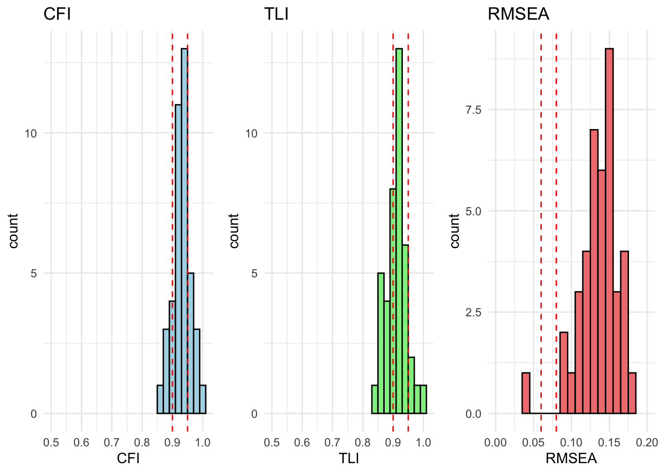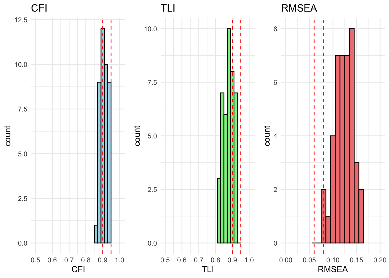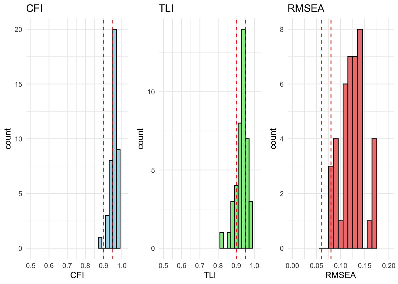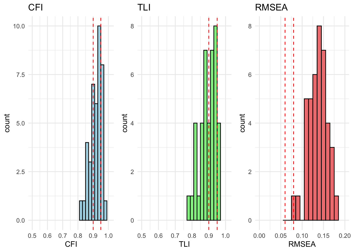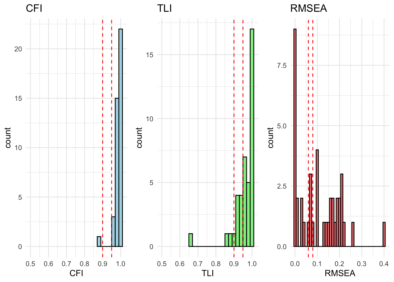 # extract relevant stats# result_fit_metric_df <- extract_fit_statistics_from_results(fit_metric)# # # runng above function over models# for (model in unique_models) {# # # if there are no modification indices, the model fits well# mod_indices <- fit_metric[[model]][["Grouped_Countries"]]$mod_indices %>% as_tibble() %>% mutate_if(is.numeric, round, 2)# # only show output if model does not fit (there are no rows)# show_output <- nrow(mod_indices) > 1# # if (show_output) {# cat("<br><h4>Model:", model, "</h4><br>")# cat("This model has inadequate fit.<br>")# cat("Overall fit statistics:<br>")# # visualize_individual_fit_statistics(# df = result_fit_metric_df, # cfa_model = model# )# # cat("Modification indices:<br>")# mod_indices %>% # kable(., caption = paste("Modification indices for", model)) %>%# kable_styling(full_width = F, latex_options = c("hold_position", "scale-down")) %>% # print()# }# }