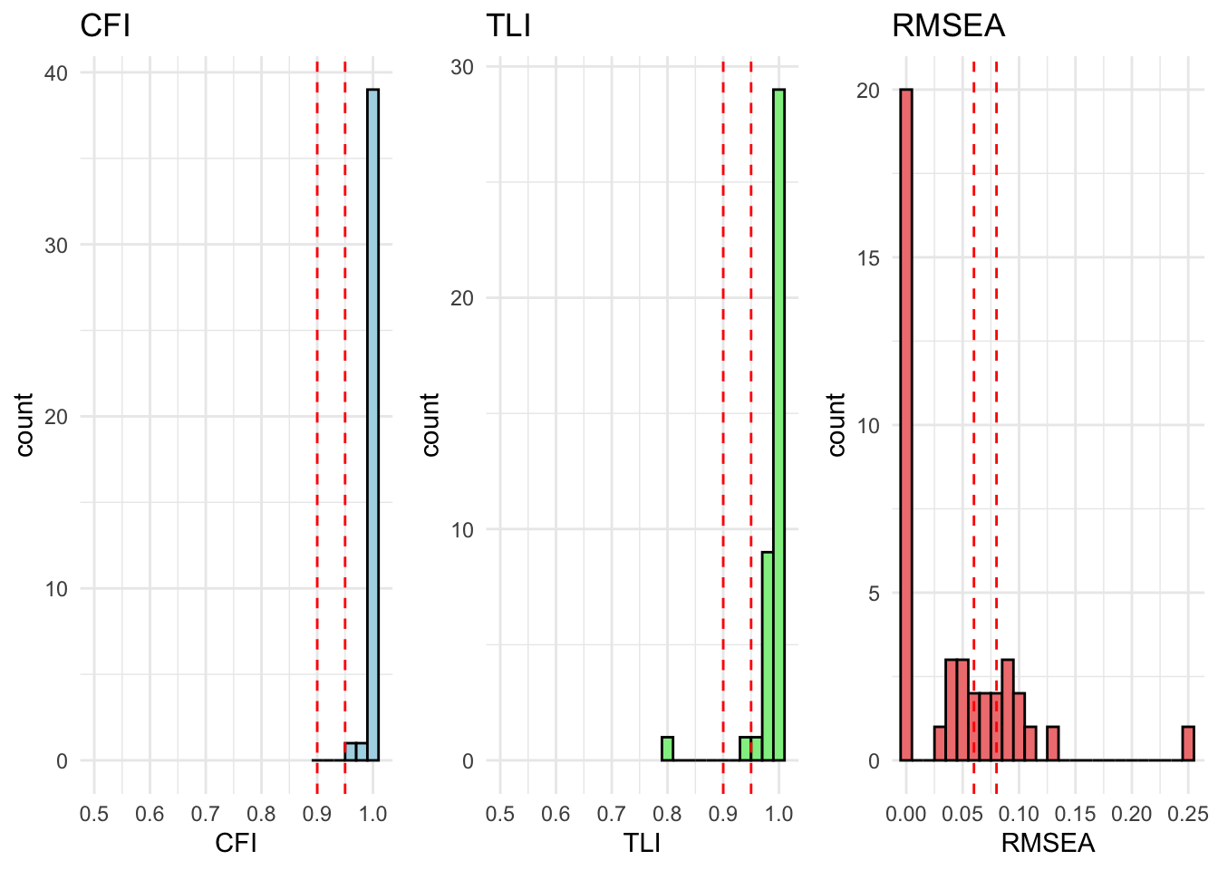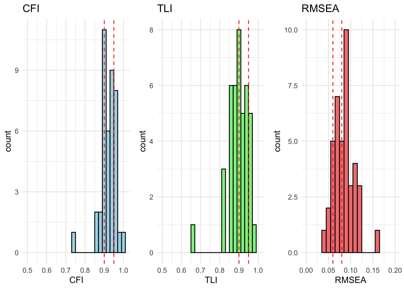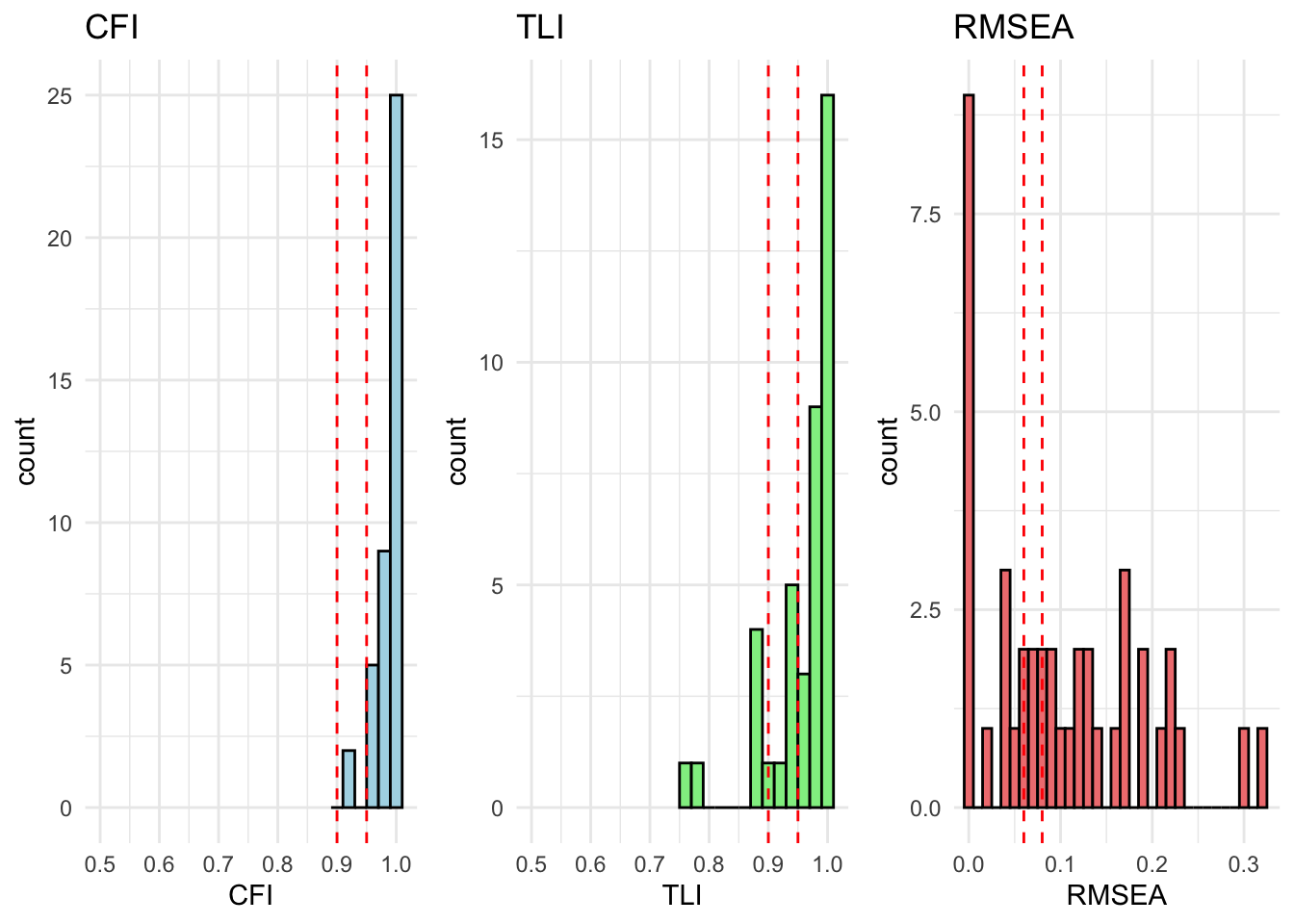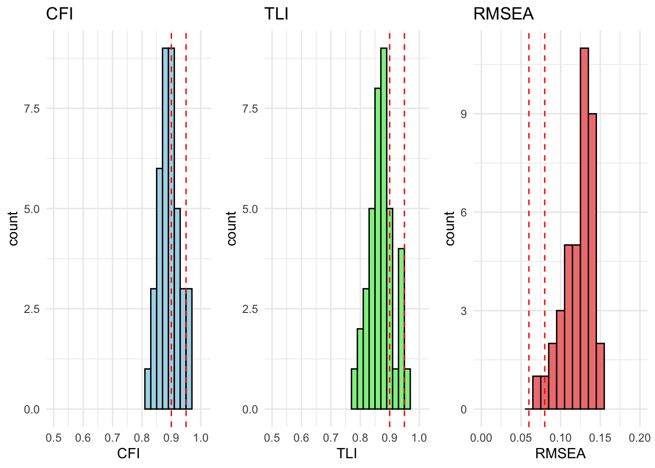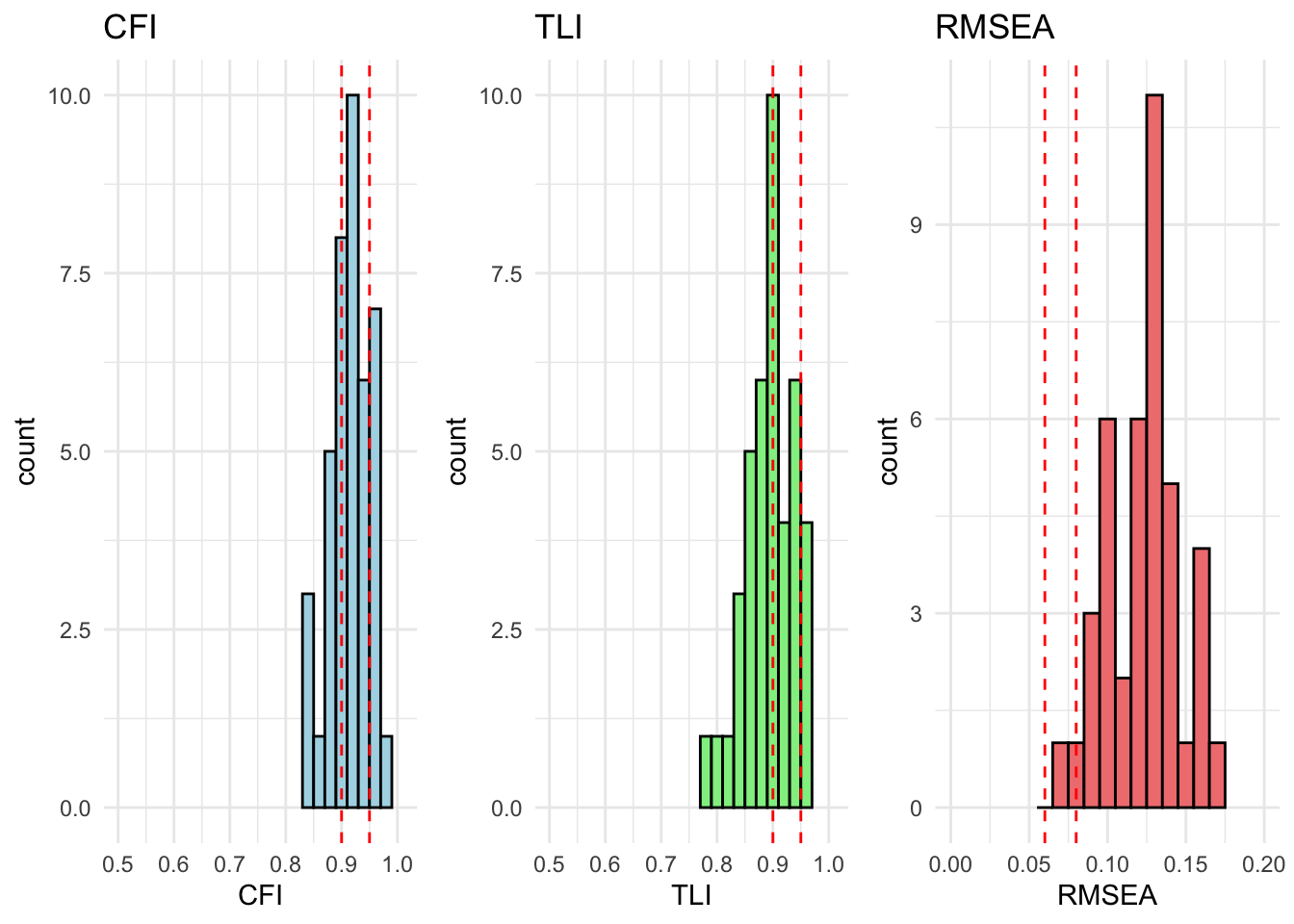 # extract relevant stats# result_fit_metric_df <- extract_fit_statistics_from_results(fit_metric)# # # runng above function over models# for (model in unique_models) {# # # if there are no modification indices, the model fits well# mod_indices <- fit_metric[[model]][["Grouped_Countries"]]$mod_indices %>% as_tibble() %>% mutate_if(is.numeric, round, 2)# # only show output if model does not fit (there are no rows)# show_output <- nrow(mod_indices) > 1# # if (show_output) {# cat("<br><h4>Model:", model, "</h4><br>")# cat("This model has inadequate fit.<br>")# cat("Overall fit statistics:<br>")# # visualize_individual_fit_statistics(# df = result_fit_metric_df, # cfa_model = model# )# # cat("Modification indices:<br>")# mod_indices %>% # kable(., caption = paste("Modification indices for", model)) %>%# kable_styling(full_width = F, latex_options = c("hold_position", "scale-down")) %>% # print()# }# }